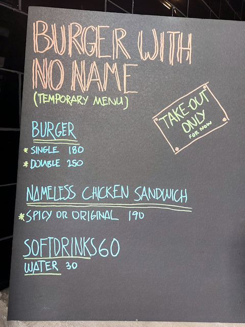 Burger with no name has returned this 2023 and they’re back with the same staff and the same great burgers with more things to be added soon to the menu. There’s now air-conditioning and seats! Since this is a soft opening, take out is encouraged as the staff may not have time to serve and clean up after customers.