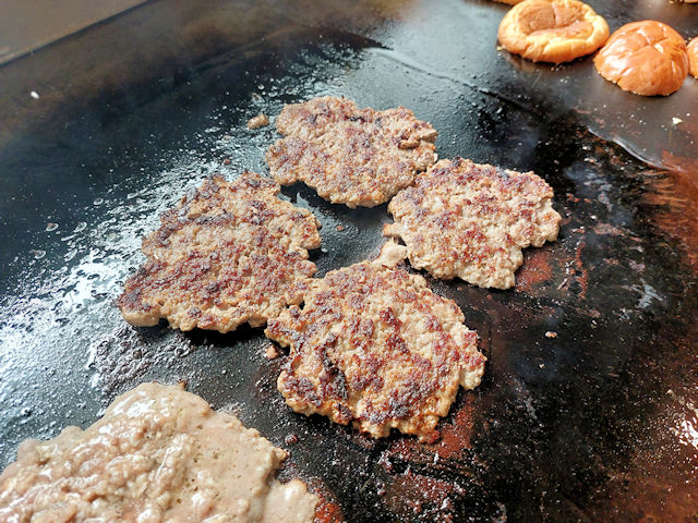 After the burgers are finished cooking, a slice of cheese is layered on top or if you got the DOUBLE patty, you’ll get two slices of cheese. More cheese equals more tasty fun.