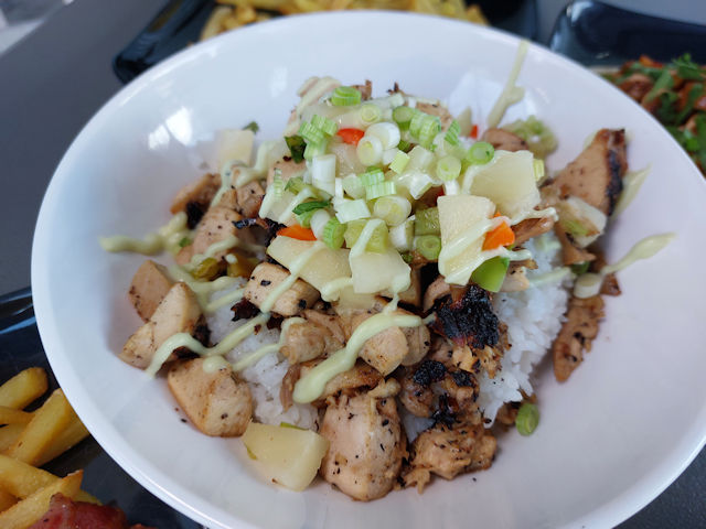 The Chicken hibachi bowl is grilled chicken with pineapple bits and a wasabi mayo sauce.. It has a nice tropical flavor that adds a bit of variety to your meal.
