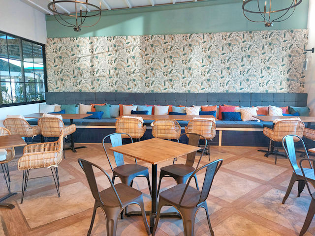 As you enter Taverna, you’ll notice the spacious and cool interiors that draw inspiration from Greece and the Mediterranean. The white walls, blue and white tiles and Bar countertop with a matching motif are among the eye- catching design features.
