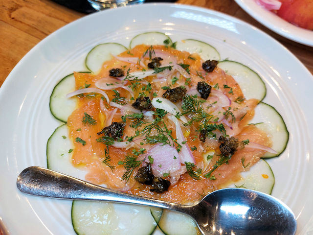Taverna Bacolod offers Salmon Gravlax as an appetizer, a type of salmon that has been cured with a mixture of salt, sugar, and dill. This dish is accompanied by pita chips and Creme fraiche, a soured cream, allowing diners to create their own tasty canapes.