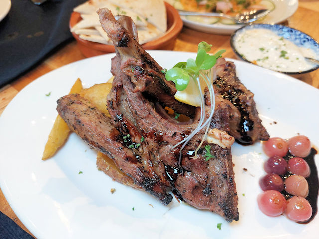 Taverna’s Lambchops is a popular dish at the restaurant. The lamb is served with sprouts, lemon wedges, potatoes, and grapes in a sauce.