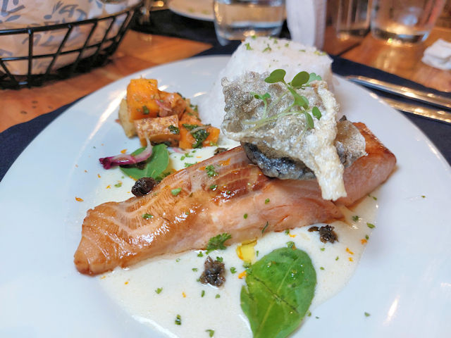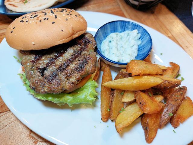 At Taverna, we decided to give the lamb burger a try. Compared to a regular beef burger, it had a meatier taste and was served with a side of fries and a delicious dip. Unlike typical American burgers, this one didn’t come with cheese but instead had a herbed cream sauce on the side. It was quite filling and a sophisticated take on a classic burger.