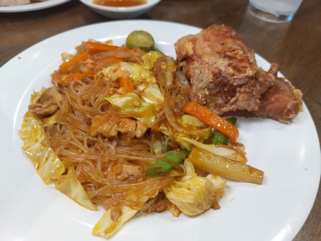 Another noodle dish that works well as a combo meal is the bihon guisado and fried chicken! Fried rice noodles with assorted vegetables work extremely well!