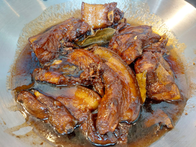Adobo is is a popular dish in the Philippines made with pork belly, soy sauce, vinegar, garlic, and bay leaves.