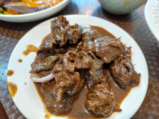 Tasty Karne Frita (Fried meat) in a thick, savory gravy.