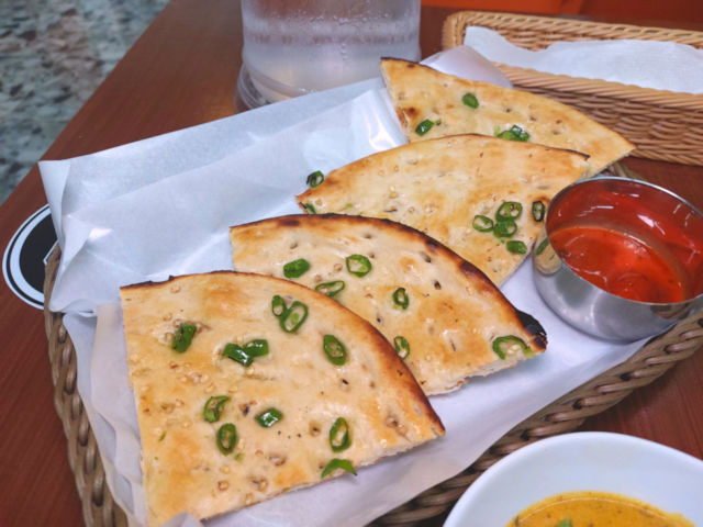The naan is extremely good. There are several types and stuffings (see the menu provided below) but we chose the green chili naan which also came with a sauce. We chose this to pair with the beef butter curry! You can see the small green chilis and seeds in the naan.