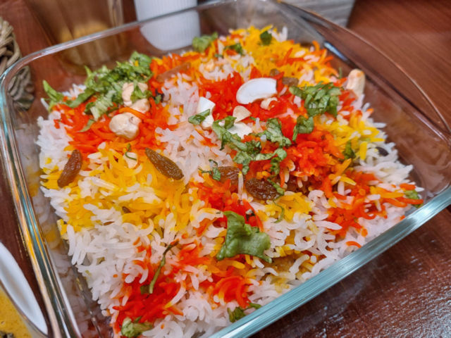 When the biryani of Aghaz Biryani and BBQ first came out, we were so surprised! This looked so colorful with the reds, whites and greens. It looked like flowers or fireworks! The smell and taste is fantastic! The colors are especially symbolic!