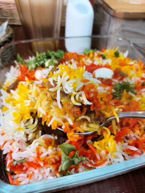If you dig down into the colorful biryani, you will see the chunks of meat. It’s extremely tasty!