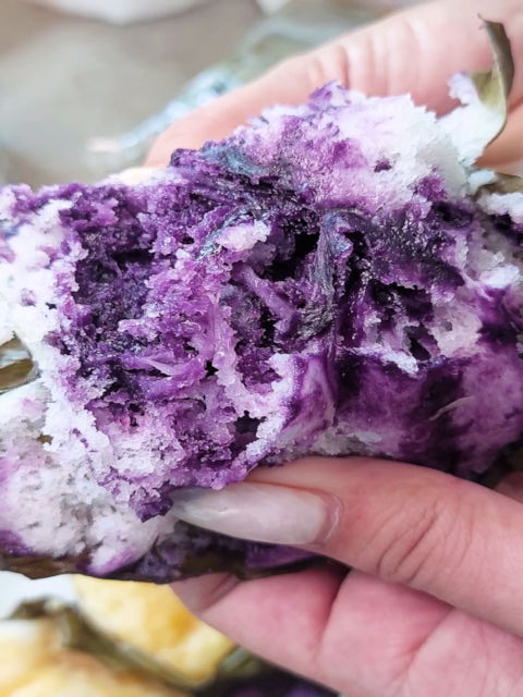 We got home, opened up the packs, and arranged them on a plate. The puto is thick and chunky, and there are 10 pieces to a pack. We got the ube and cheese flavors.