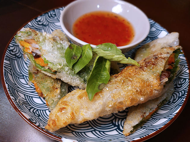 Fried Vietnamese Spring rolls: Fried rice wraps filled with carrots, lettuce, coriander, and mint.