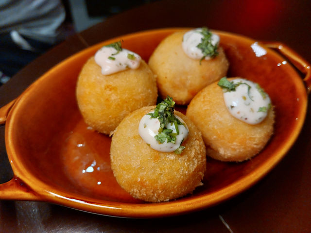 Laarb mo croquettes: potato croquettes filled with minced pork and basil. It’s a little spicy, making it perfect for drinks!