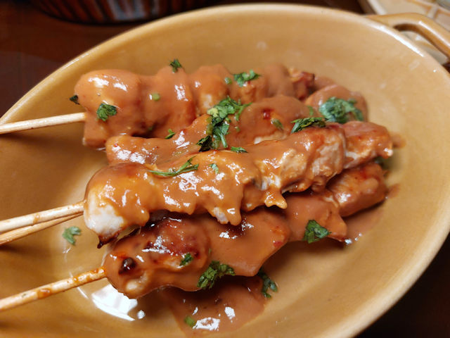 Malaysian Chicken Satay: Barbecued chicken in Satay Sauce! Super tasty! Went very well with the Whisky Sour!
