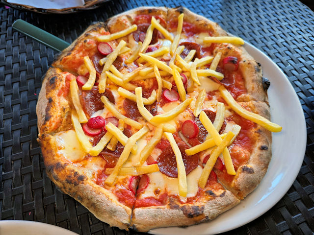 This is the Amore pizza – its a woodfire oven pizza with pepperoni, hotdogs and French fries?