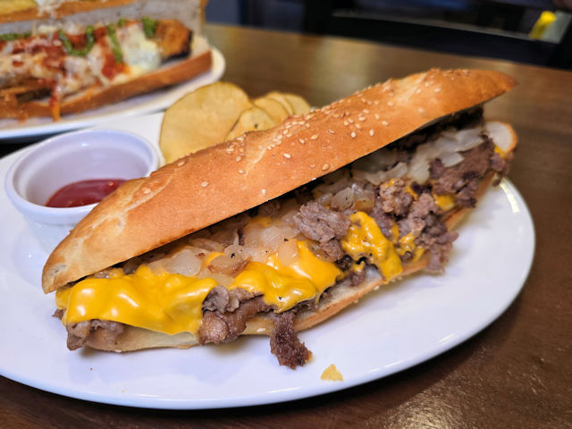 A Philly cheesesteak is a classic American sandwich that originated in Philadelphia. Sugaree Cafe and Gelato’s version features thinly sliced beefsteak topped with melted cheese and placed inside their signature crusty roll accompanied by sautรฉed onions,