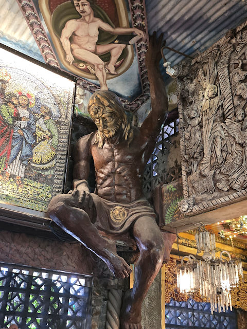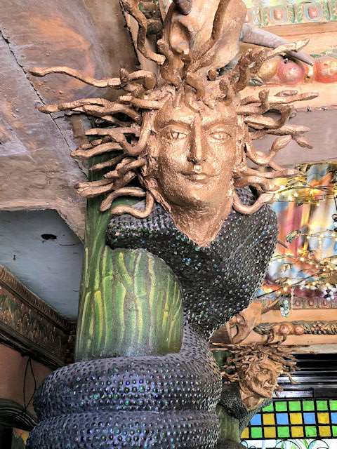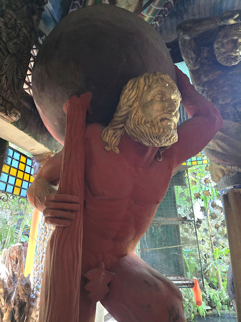 It is a visual feast when you walk in the gate! There are beautiful sculptures, mosaics, and paintings by Michael Villarosa. Medusas twine around pillars with marbles as scales… Atlas holds up a globe while titans hold up the corners of the room! 🐍🌍