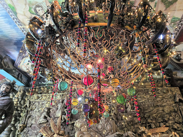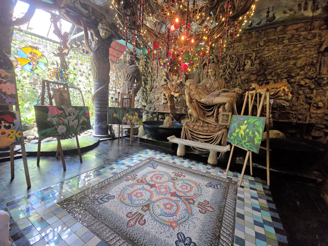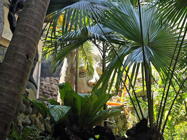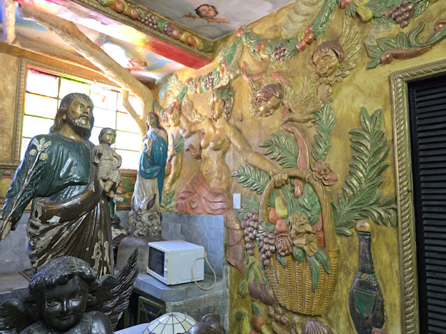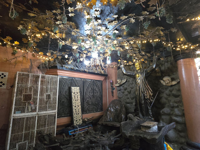 A massive Pieta dominates the ground floor, along with a garden that has iron grapevines (complete with iron grapes) that twine toward a balcony. Don’t forget to see the pond with the massive stone head staring at guests as they arrive! 🗿🍇